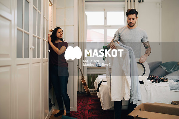 Man packar upp skjortor medan kvinna tittar på i sovrum