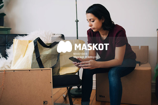 Koncentrerad kvinna sitter på flyttlåda och skriver på smartphone
