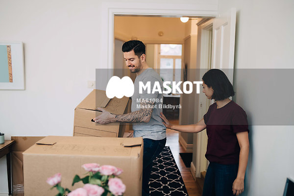 Kvinna hjälper till när man bär flyttlåda in i rum