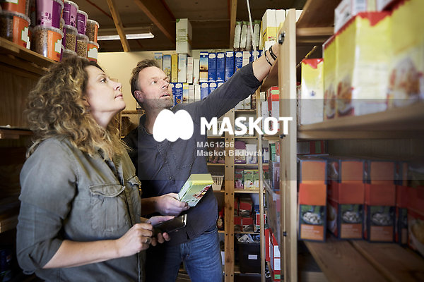 Volontärer hjälps åt att undersöka matförpackningar i lager