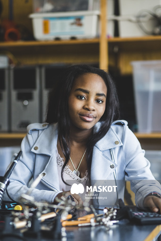 Porträtt av leende gymnasieelev vid arbetsbord i klassrum