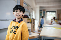 Pojkar vid skrivbord lyssnar under lektion i klassrum