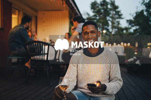 Porträtt av leende man med smartphone i handen i trädgård