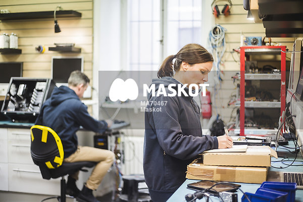 Tekniker antecknar vid arbetsbord medan kollega arbetar i bakgrunden