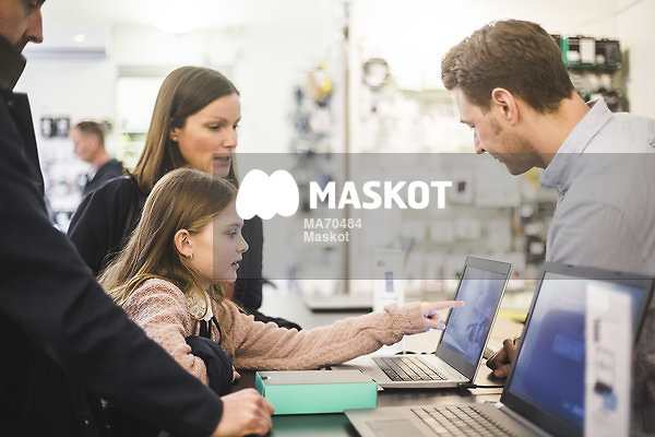 Flicka pekar på laptopskärm för familj och säljare i affär
