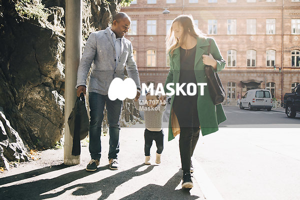 Föräldrar går med dotter emellan sig på trottoar