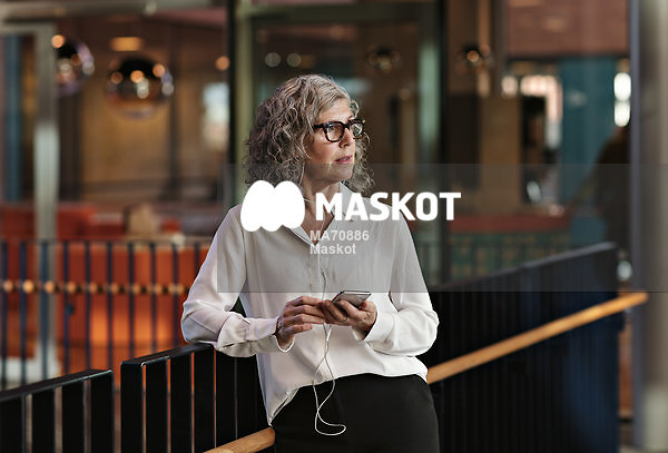 Fundersam kvinna står lutad mot räcke på kontor och pratar i mobiltelefon