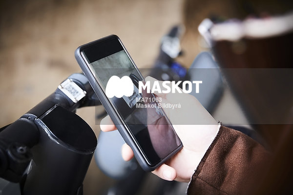 Kille scannar in QR-kod på elscooter med mobilkamera