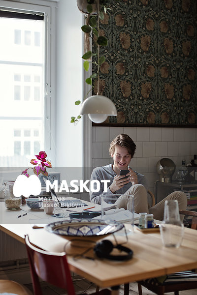 Leende tonåring sitter vid matbord i kök och läser på mobiltelefon