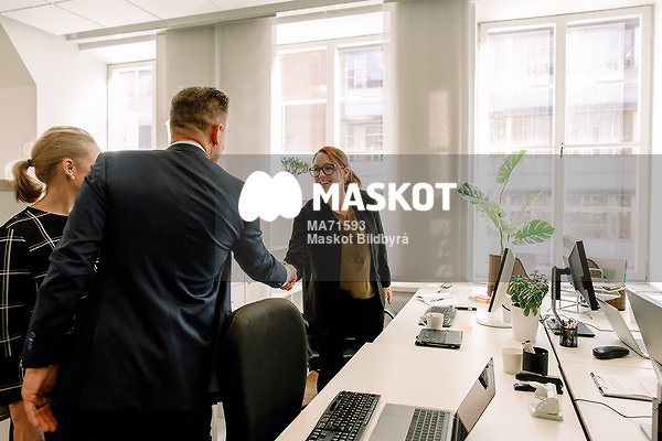 Konsult hälsar på kollega bredvid skrivbord på kontor