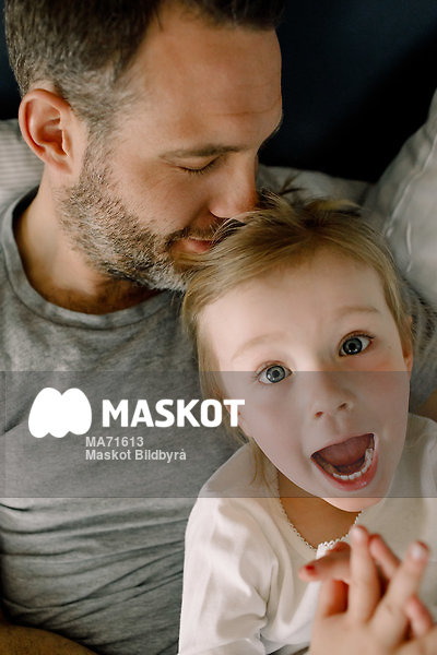 Porträtt av grimaserande flicka bredvid pappa i säng