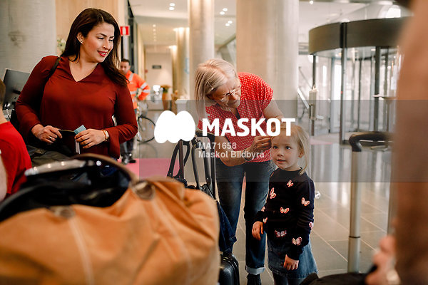 Leende mamma tittar på medan mormor sätter upp barnbarns hår