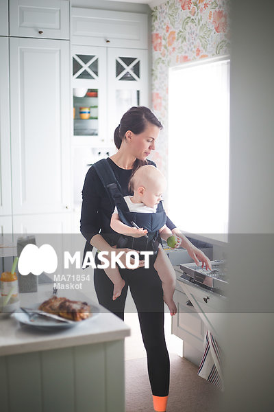 Kvinna bär dotter i bärsele i kök hemma