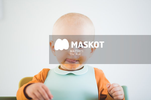 Porträtt av bebis med haklapp som slickar sig runt munnen
