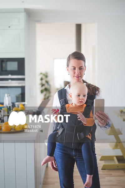 Influencer bloggar på mobiltelefon med dotter i bärsele i kök hemma