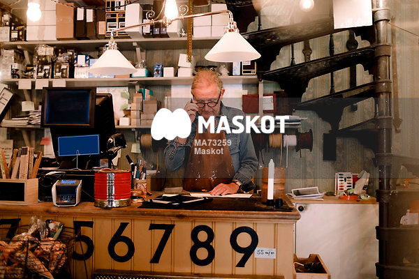 Självsäker äldre entreprenör arbetar i kassa i butik