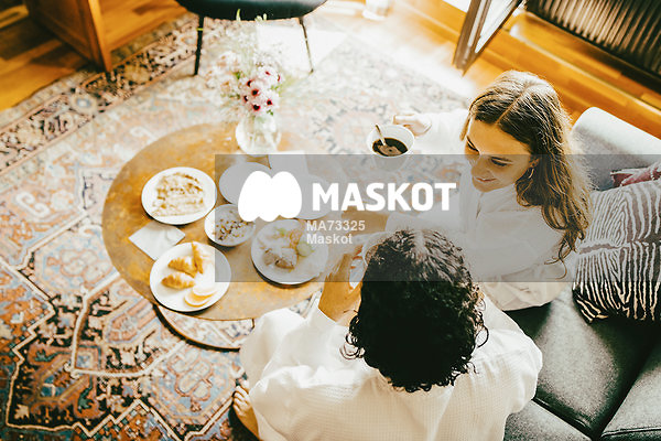 Ungt par sitter tillsammans i hotellrum och äter frukost