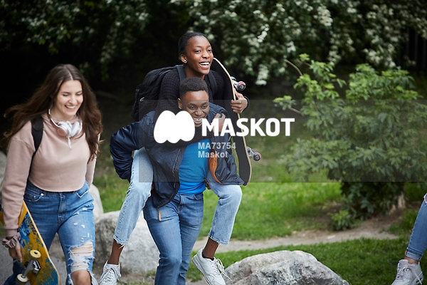 Glada vänner går med skateboards i park
