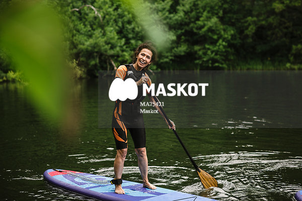 Porträtt av leende äldre kvinna på surfbräda i sjö