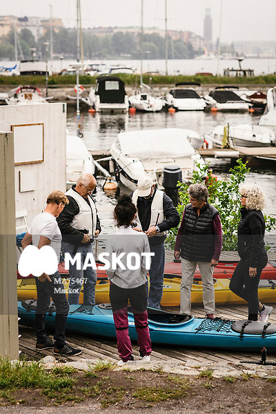 Grupp vänner tar på sig flytvästar under paddelkurs