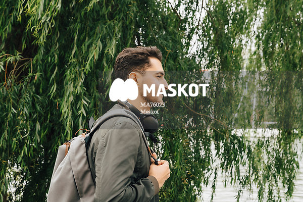 Man med hörlurar runt halsen går längs vattnet i stad