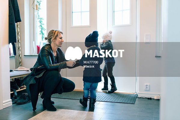 Mamma hjälper barn klä på sig i hallen