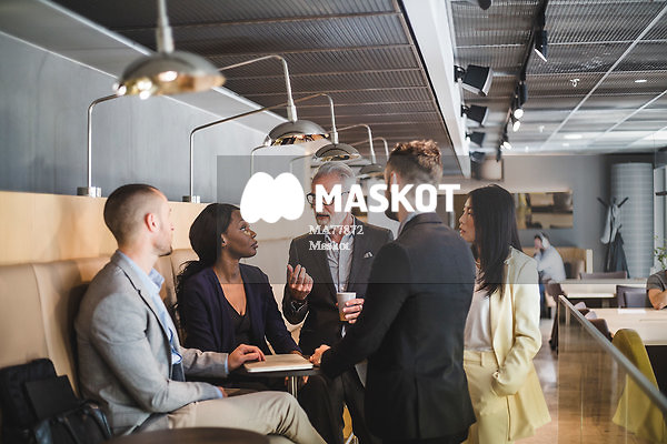 Engagerad man diskuterar med kollegor i kafeteria