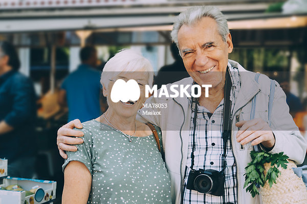 Porträtt av glatt äldre par som håller om varandra stående på marknad