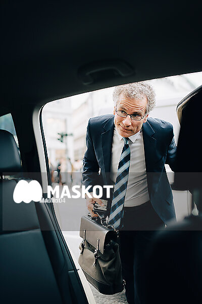 Manlig entreprenör går in i taxibil i stad