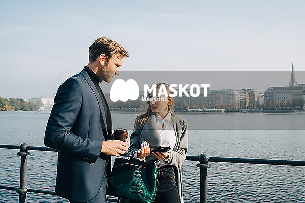 Två kollegor står vid flod i stad och pratar