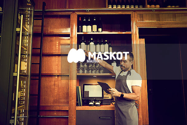 Manlig ägare kontrollerar vinlista i app på restaurang