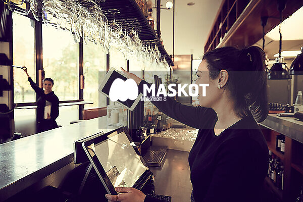 Kvinna bakom bardisk pekar för kollega i restaurang