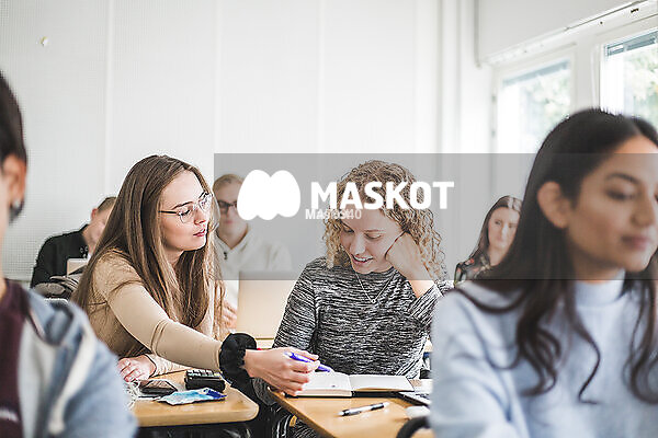 Kvinnliga studenter diskuterar uppgift i klassrum