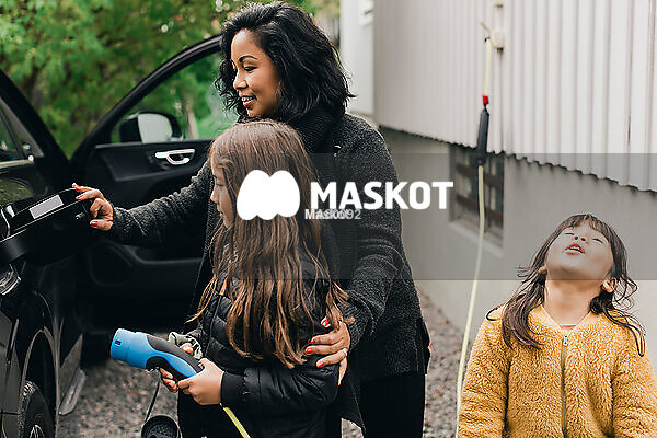Kvinna lär dotter ladda elbil på laddningsstation