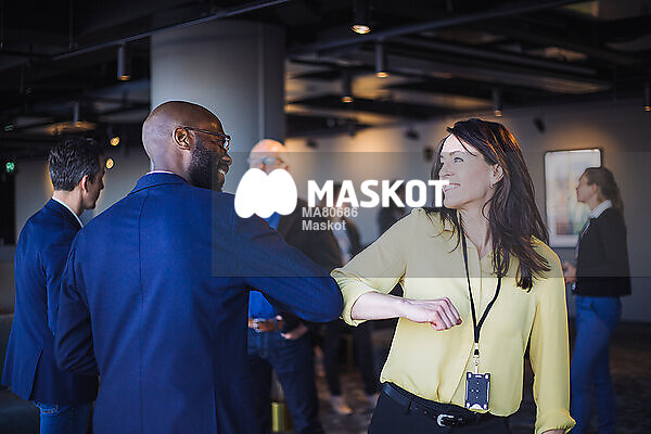 Manlig entreprenör hälsar på kvinnlig kollega med armbåge på kontor