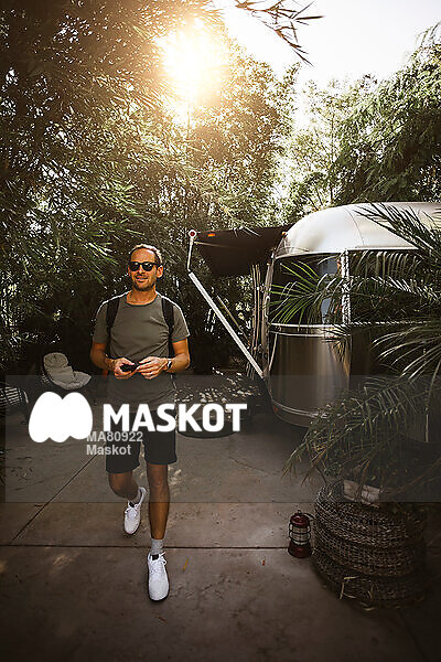 Leende man går med mobiltelefon framför husvagn