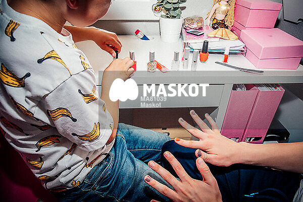 Bröder målar naglarna vid toalettbord hemma