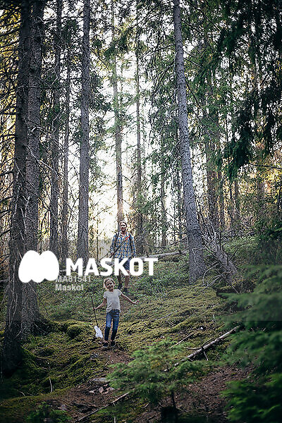 Leende flicka och pappa går i skog