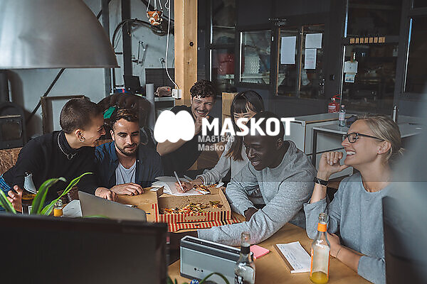 Skrattande kollegor äter pizza och diskuterar kod på kontor