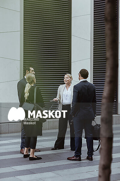 Leende kvinnlig entreprenör pratar med kollegor på gata i stad