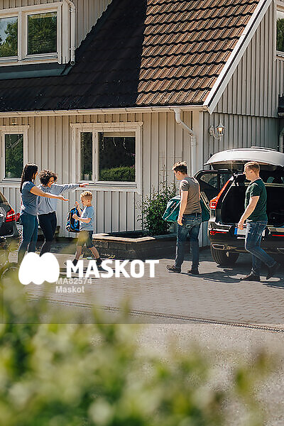 Pappor lämnar över son till mammor vid hus