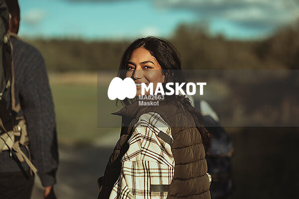 Porträtt av leende kvinna med vänner på vandring