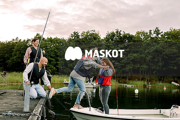 Tonårstjej hjälper syster kliva ombord på båt medan föräldrar står på brygga och tittar