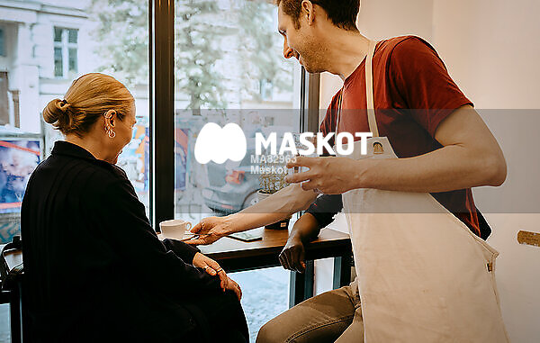 Leende ägare serverar kaffe till kund vid fönster på café