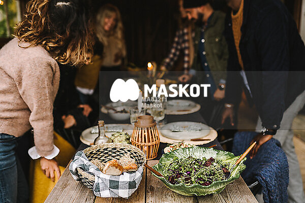 Kvinnor och män stående runt middagsbord i stuga