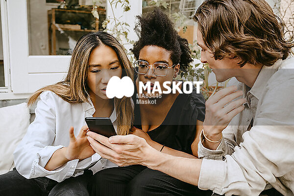 Man visar smartphone för kvinnliga vänner på altan