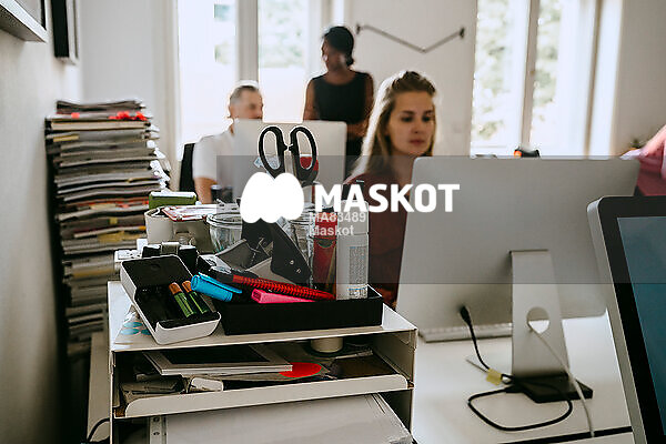 Kvinna arbetar vid dator på kontor med kollegor i bakgrunden