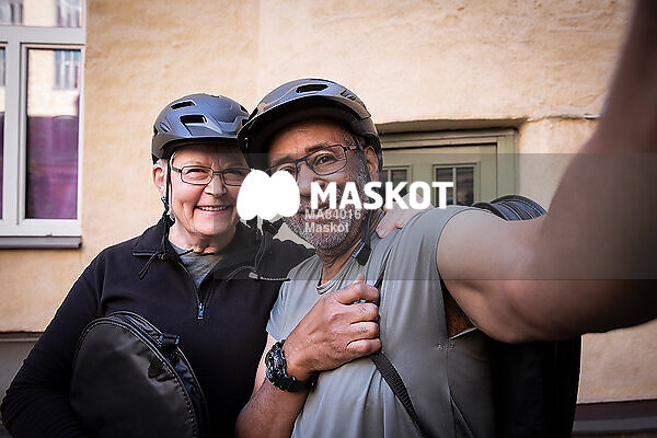 Aktivt äldre par med hjälmar tar selfie på gata