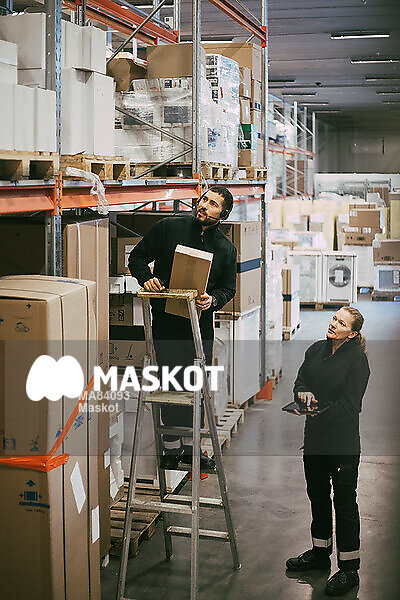 Kvinna står bredvid medan man på stege kontrollerar paket
