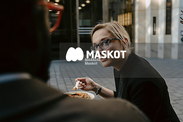 Entreprenör diskuterar med kollega under lunch på torg
